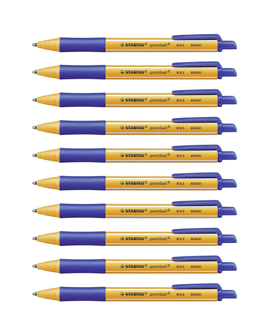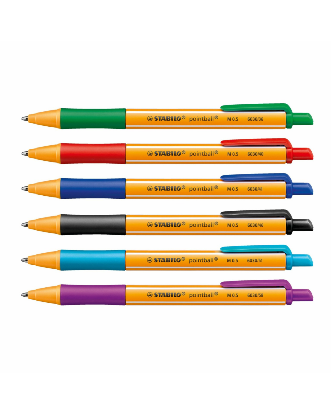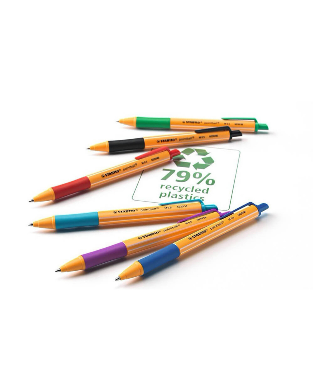 Voor het schrijven op kantoor, school of de universiteit of voor aantekeningen thuis is de STABILO pointball steeds de juiste keuze. Zijn kleurrijke design in oranje met witte strepen doet aan de wereldberoemde STABILO point 88 Fineliner denken. Door de antislip gripzone ligt de balpen comfortabel en veilig in de hand en glijdt niet weg. De extreem zachte balpeninkt zorgt ervoor dat de pen snel en comfortabel schrijft. In het belang van het milieu bestaat de balpen met het praktische klikmechanisme voor een groot deel uit gerecyclede kunststof en kan als hij eenmaal leeg is met de STABILO Ballpoint navullingen steeds weer worden nagevuld. Van de zes schrijfkleuren blauw, zwart, rood, groen, lila en turquoise waarin de pen verkrijgbaar is, zijn de kleuren blauw, zwart en groen documentecht.